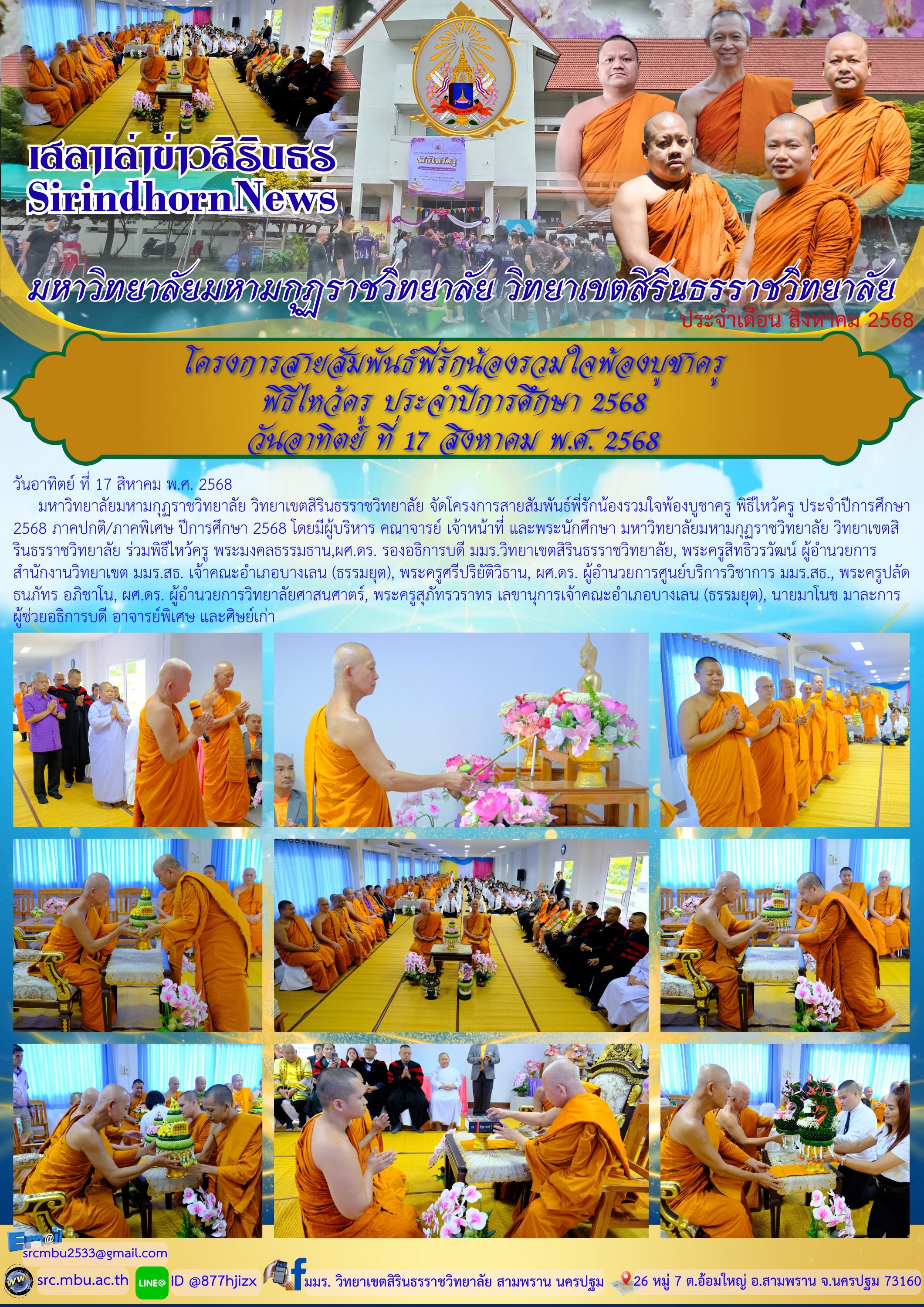 18 กันยายน 2568เสลาเล่าข่าวสิรินธร งานทำบุญอุทิศถวายบูรพาจารย์อดีตเจ้าอาวาสวัดเนรัญชราราม